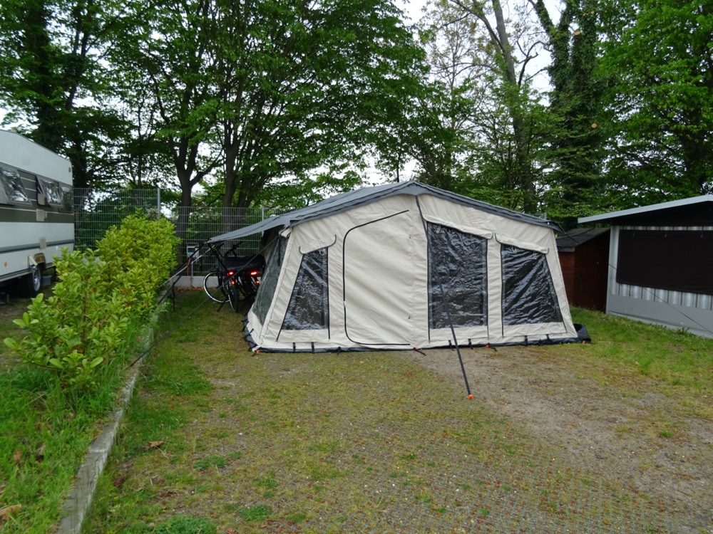Obwohl wir einen großen Rasenplatz gebucht hatten, bekamen wir einen angegrünten,